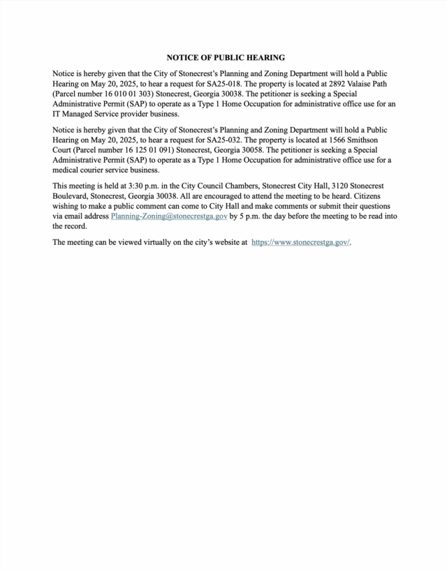 Home»Legal Notices»City of Stonecrest Public Hearing for Special Administrative Permits, May 20, 2025