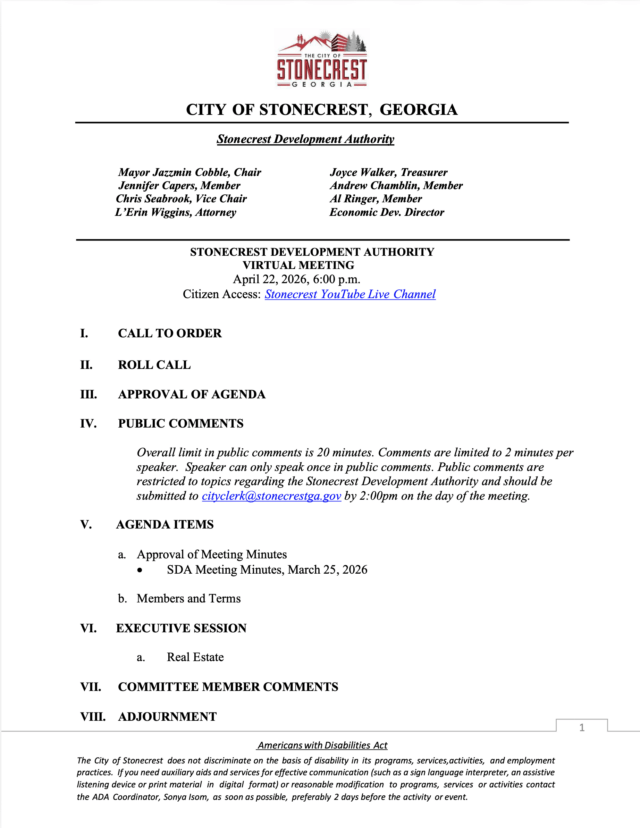 Home»Legal Notices»City of Stonecrest SDA Meeting 22 April 2026