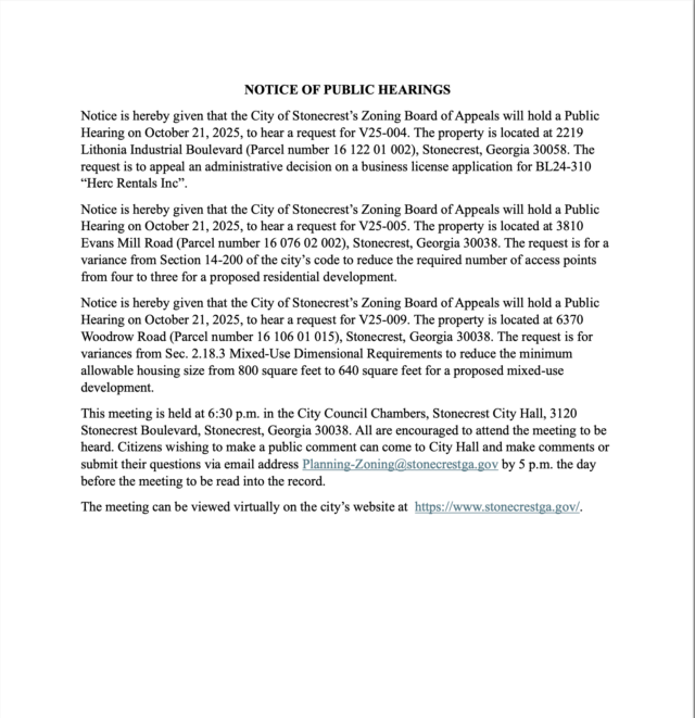 Home»Legal Notices»Updated 9.23.2025: City of Stonecrest Zoning Board of Appeals Meeting, October 21, 2025