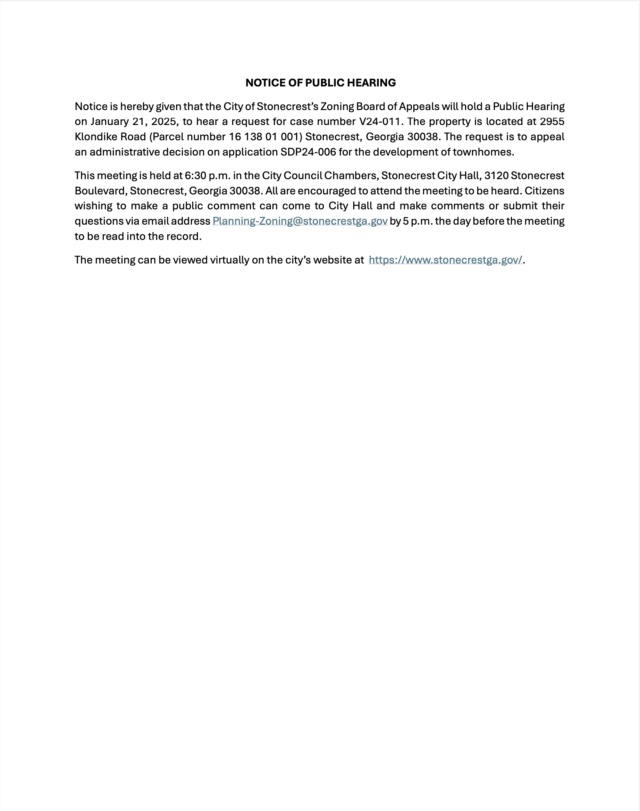 Home»Legal Notices»City of Stonecrest Zoning Board of Appeals, January 21, 2025
