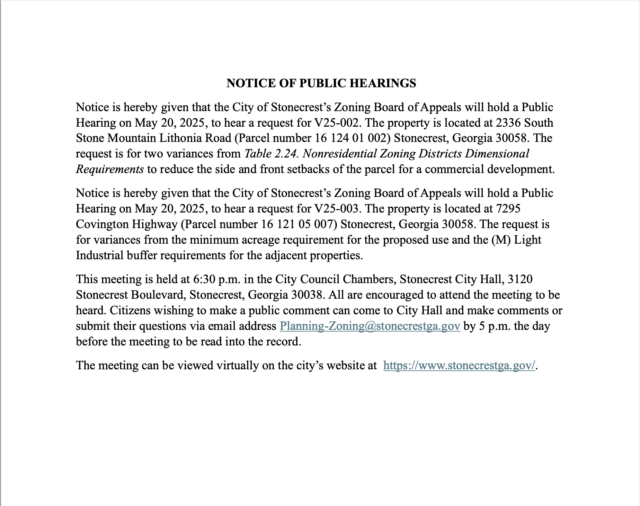 Home»Legal Notices»City of Stonecrest Zoning Board of Appeals, May 20, 2025