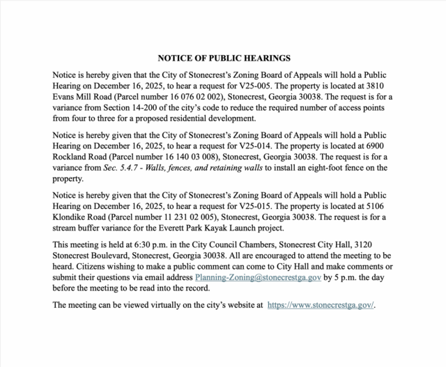 Home»Legal Notices»City of Stonecrest Zoning Board of Appeals Meeting, December 16, 2025