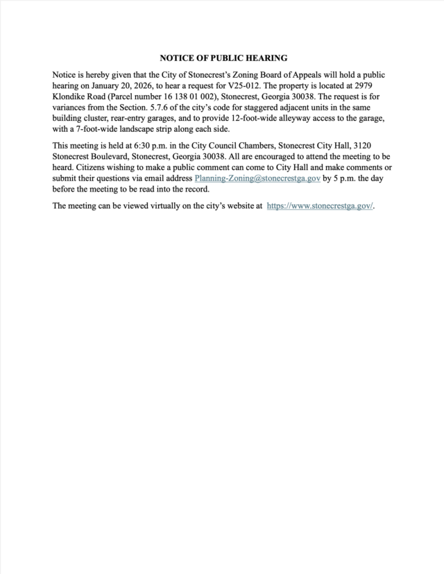 Home»Legal Notices»City of Stonecrest Zoning Board of Appeals Meeting, January 20, 2026