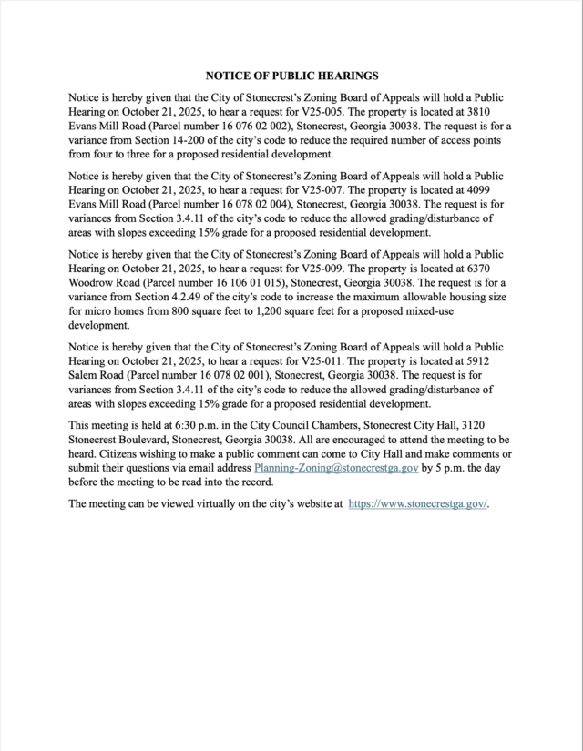 Home»Legal Notices»City of Stonecrest Zoning Board of Appeals, October 21, 2025