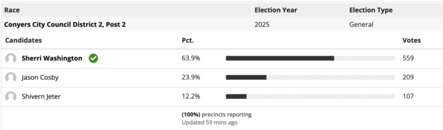 “I want to thank the residents, my neighbors in the City of Conyers for supporting me and having faith in me to elect me. I look forward to making a difference in our city,” Washington said. “Together, we are going to make Conyers an even better place to live worship, and play.”