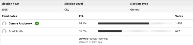Meanwhile, in the city’s other contested race, Sherrie Washington soundly won the three-way race for the District, Post 2 City Council seat. Washington received 63.89% (559 votes) on Tuesday, according to unofficial votes. Jason Cosby came in second with 23.89% (209 votes), and Shivern Jeter placed third with 12.23% (107 votes).