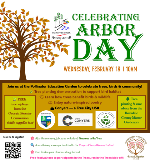 CONYERS, GA– Conyers will host its annual Arbor Day celebration on Wednesday, Feb. 18, from 10 a.m. to 11:30 a.m., at the Big Haynes Creek Nature Center.