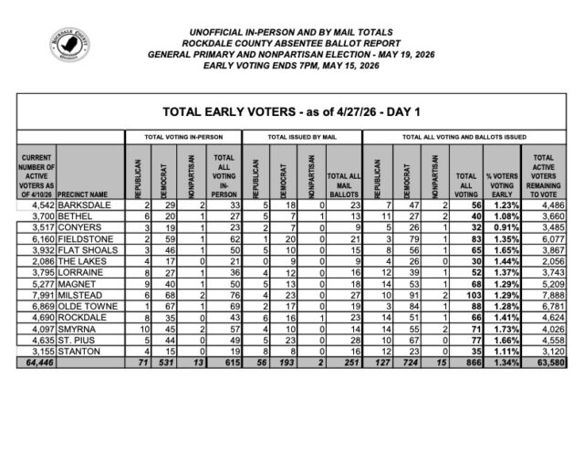 ROCKDLE COUNTY, GA–Early voting for the May 19 General Primary and Non-partisan elections is now underway and it’s off to a slow start. Cynthia Willingham, director of Rockdale County’s Board of Elections and Registration, reported just over 800 voters turned out on Monday, April 27, the first day of the Early Voting period, which runs April 27- May 15. Willingham reports there are 64,446 eligible active voters in Rockdale.
