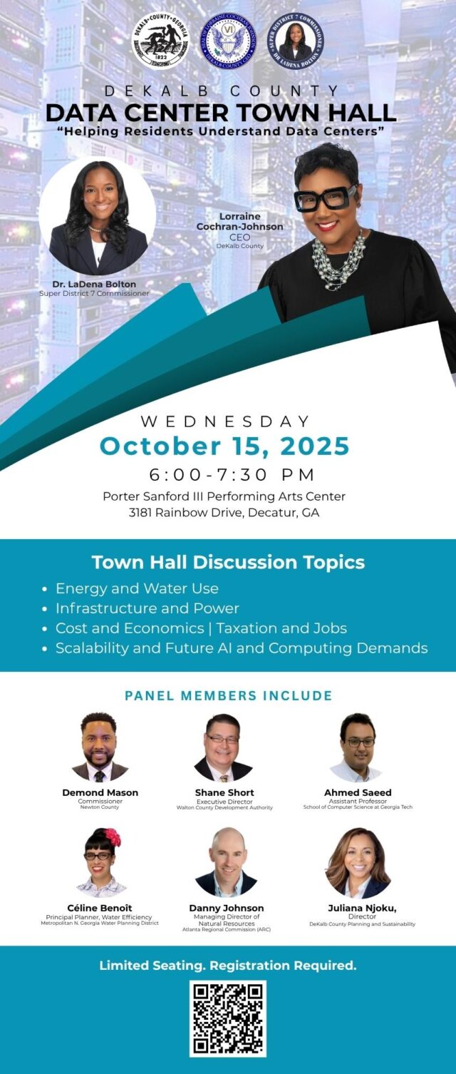 DEKALB COUNTY, GA-DeKalb CEO Lorraine Cochran-Johnson and Super District 7 Commissioner LaDena Bolton will host a Data Center town hall on Wednesday, Oct. 15, 6 to 7:30 p.m., at the Porter Sanford III Performing Arts Center, 3181 Rainbow Drive, Decatur.