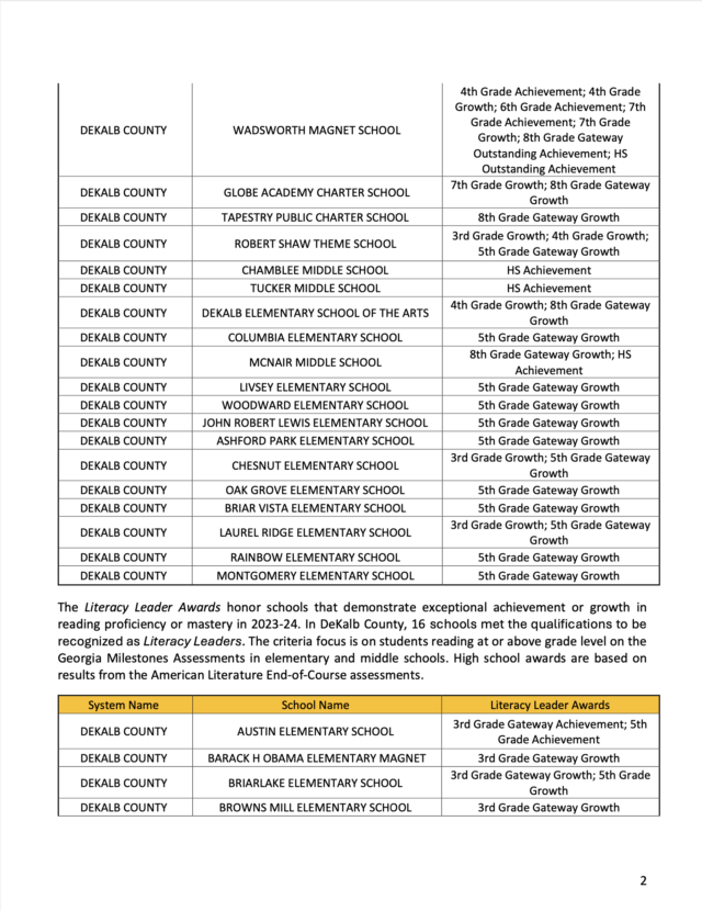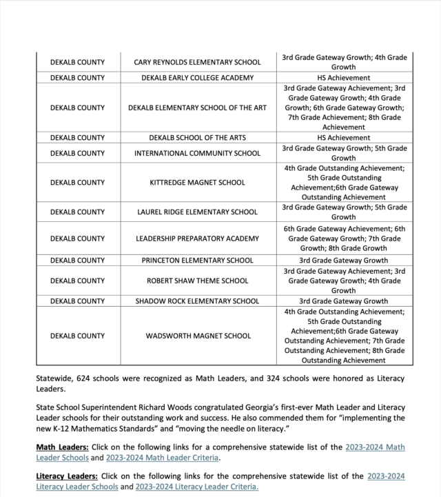 schools have been recognized by the Georgia Department of Education as Math Leaders and Literacy