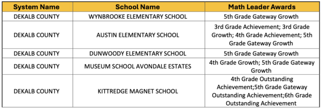The Math Leader Awards honor schools for exceptional achievement or growth in mathematics. In DeKalb