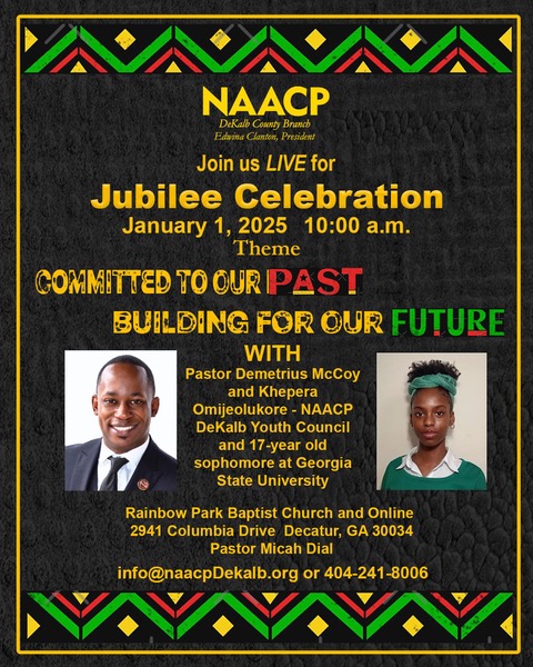 DEKALB COUNTY, GA –The DeKalb County NAACP will host its Jubilee Day 2025 Celebration on Jan. 1, 10 a.m., Rainbow Park Baptist Church, 2941 Columbia Drive, Decatur.