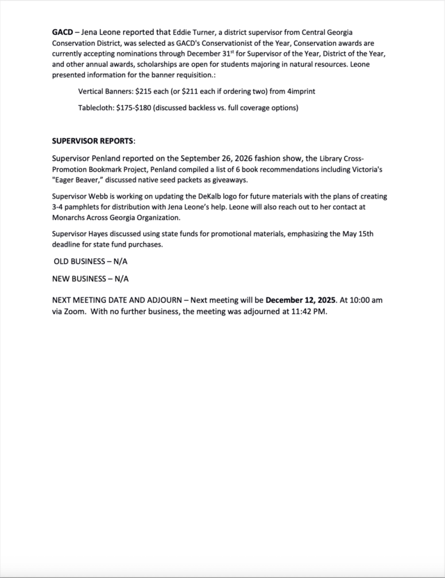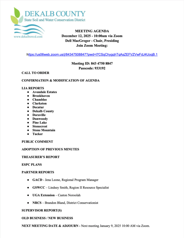 DEKALB COUNTY, GA—The upcoming DeKalb County Soil and Water Conservation District meeting will be held Dec.12 at 10 a.m. Eastern Standard Time via Zoom.