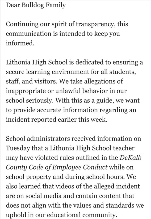Lithonia High Principal Mulanta Wilkins notified parents via text messaging/email about the incident on Thursday afternoon, Feb. 27, stating that school officials first learned of the incident two days earlier. Wilkins did not provide a reason for the delay in notifying parents but stated that King had been placed on administrative leave pending an investigation by the DeKalb County School District Employee Relations Department.