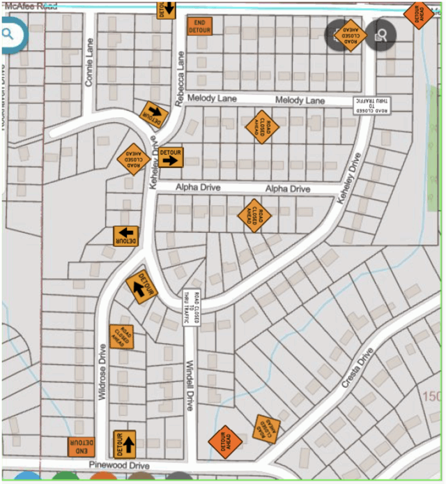 Road closure and detour signs will be placed during the road closure period advising motorists of construction work in the area and of local traffic restrictions.