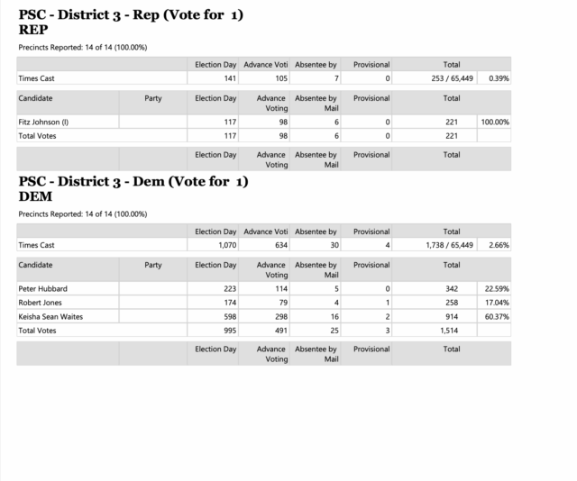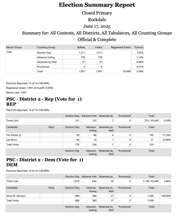 Turnout for the PSC races was extremely light with only 3.04 percent (1,991) of Rockdale’s 65,449 registered voters casting ballots, Willingham’s summary report shows.