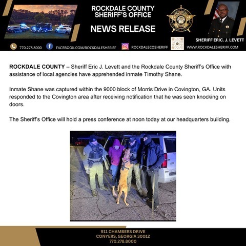 ROCKDALE COUNTY, GA–The Rockdale County Sheriff’s Office posted at 8:30 a.m. today, Dec. 3,  that escaped inmate Timothy Shane has been captured in Covington, GA after being on the run since he was hospitalized on Sunday at Grady Hospital in Atlanta following a reported suicide attempt.  Covington, GA is in neighboring Newton County next to Rockdale.
