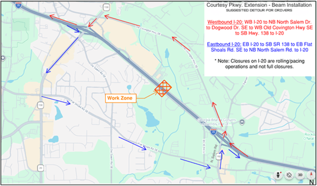 ROCKDALE COUNTY, GA– Portions of I-20 will be closed intermittently March 2-4 as construction crews work on the new Courtesy Parkway Bridge, officials have announced.