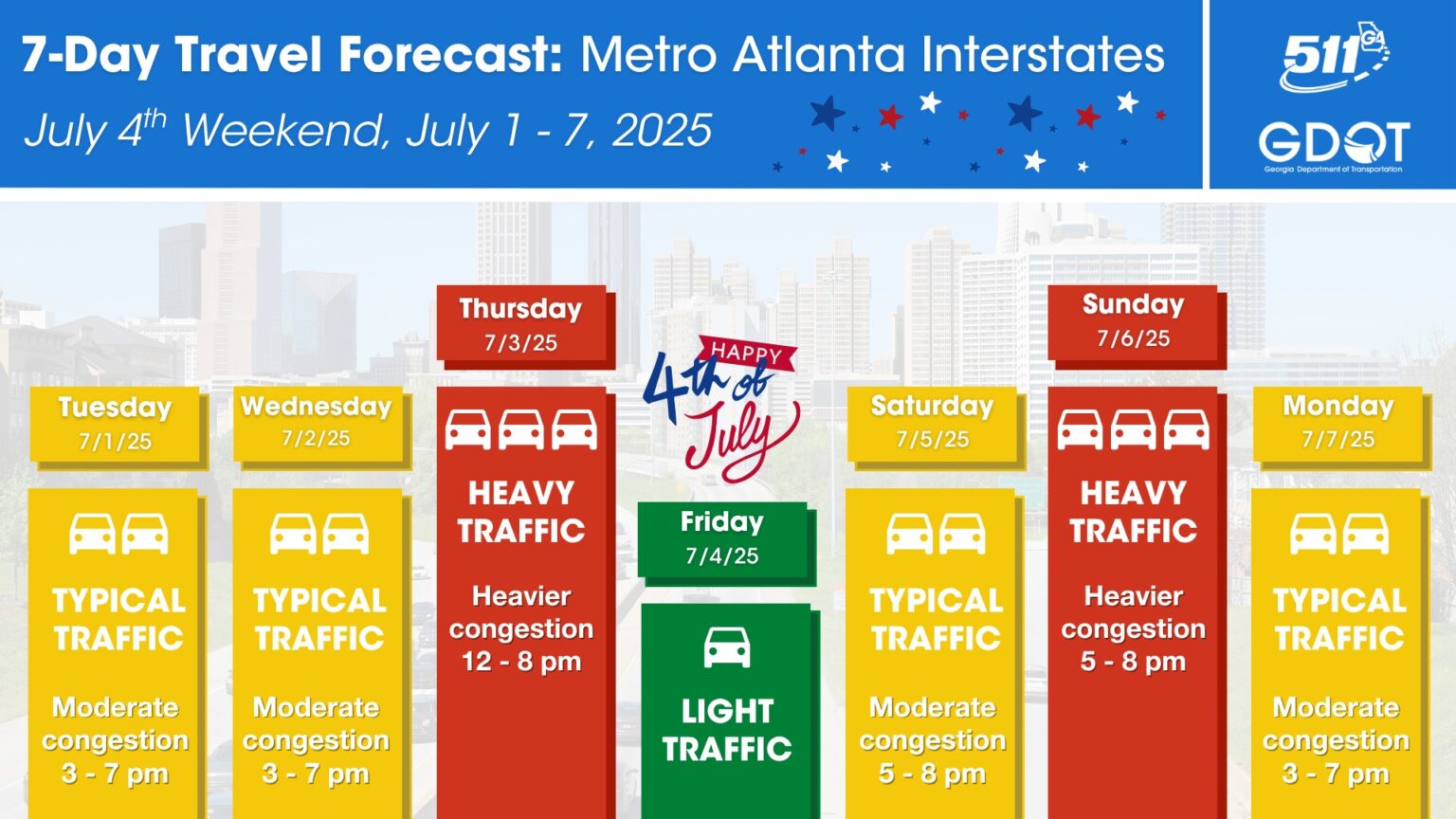 Historical July 4th travel data from the 2024 holiday week has shown the following traffic trends for the metro Atlanta area: