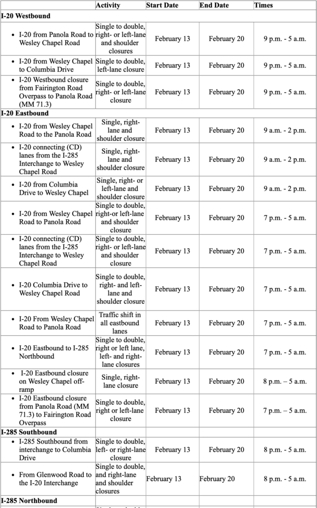 • I-20 Eastbound (connecting lanes or CD lanes): Single to double, right- or left-lane and shoulder closure from I-285 Interchange (MM 67.3) to Wesley Chapel Road (MM 69.5)