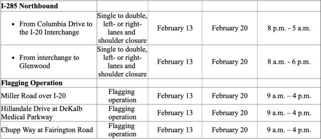 • I-285 Northbound: Single to double, left- or right-lanes and shoulder closure from interchange to Glenwood