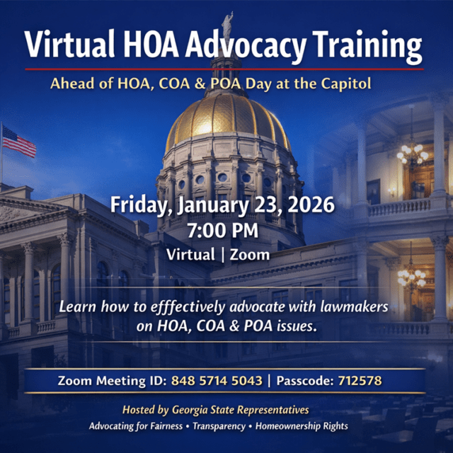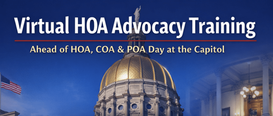 The training precedes HOA, COA and POA Advocacy Day at the Capitol, hosted by Reps. Davis, Schofield and Scott, on Tuesday, Jan. 27, at 10 a.m., in room 216 of the Georgia State Capitol, when constituents from across Georgia will meet with members of the House and Senate to discuss housing-related issues.