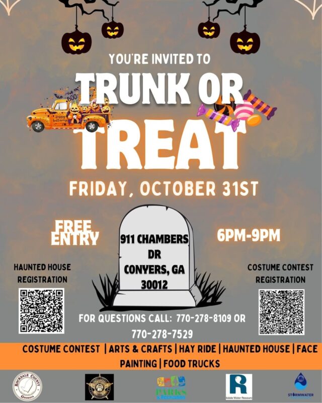 The events listed below are free and some include additional activities such as the haunted house that will be held at the Rockdale County Sheriff’s Office parking lot. Looking for a safe alternative for the kids to enjoy their costumes and treats on Oct. 31? Check out the trunk or treat events from our community partners in DeKalb, Rockdale and Gwinnett counties.