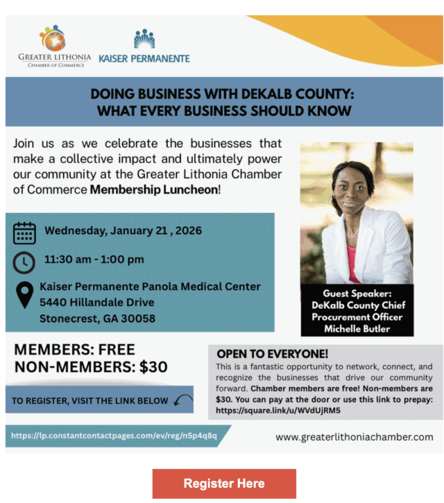 The Greater Lithonia Chamber of Commerce will host its first luncheon of 2026 on Wednesday, Jan. 21, 11:30 a.m., at Kaiser Permanente Panola Medical Center, 5440 Hillandale Drive, Stonecrest, GA. The Chamber is seeking new members to join and will focus on helping local businesses better understand how to do business with DeKalb County.