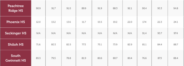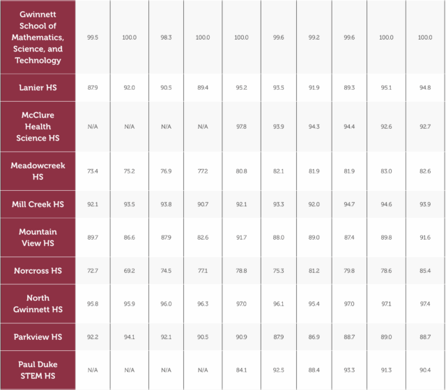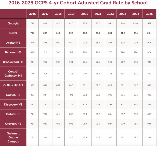 According to the Georgia Department of Education, Gwinnett’s Class of 2025’s four-year Adjusted Cohort Graduation Rate rose from the district’s Class of 2024 from 84.1%. Federal guidelines stipulate that the rates are based on the number of students who graduate in four years with a regular high school diploma divided by the number of students who form the adjusted cohort for the graduating class. From the beginning of 9th grade, students entering that grade for the first time form a cohort that is subsequently “adjusted” by adding any students who transfer into the cohort during the next three years and subtracting any students who transfer out.