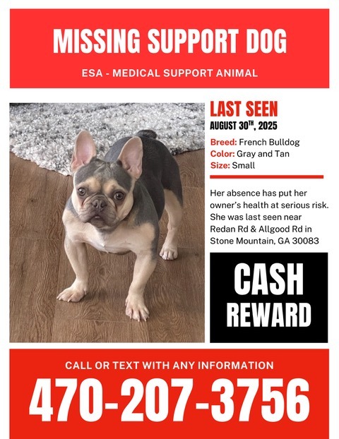 Nala is a French Bulldog, who went missing from the Carriage Cluster neighborhood, located near Redan and Allgood roads in Stone Mountain.