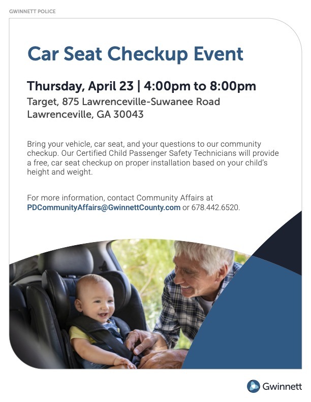 LAWRENCEVILLE, GA– Join the Gwinnett County Police Department’s Community Affairs Section for a free Child Passenger Car Seat Checkup event at Target, 875 Lawrenceville-Suwanee Rd, Lawrenceville, GA.