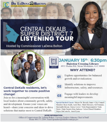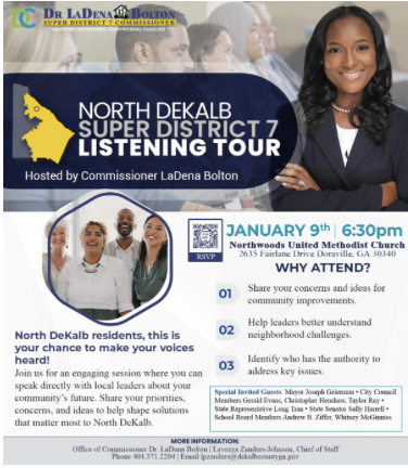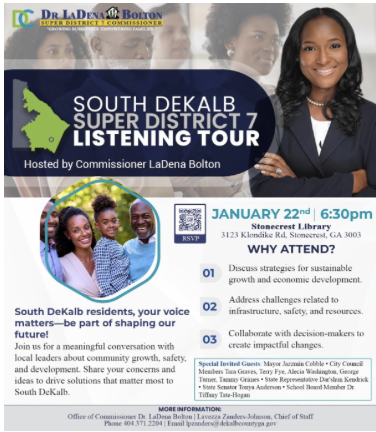 DEKALB COUNTY, GA– DeKalb County’s Super District 7 Commissioner LaDena Bolton will host three community listening sessions beginning this week—North DeKalb, Central DeKalb and South DeKalb. As the newly-elected Super District 7 commissioner, Bolton represents approximately 385,000 residents who live in the eastern half of the county including unincorporated DeKalb and the cities of Doraville, Tucker, Pine Lake, Stone Mountain, Stonecrest and Lithonia.