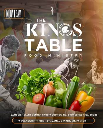 On Saturday, Nov. 1, beginning at 9 a.m., New Birth and its 501(c)3 nonprofit outreach ministry, The King’s Table (TKT), will provide food to more than 2,000 families on the church’s campus located at 6400 Woodrow Road in Stonecrest. The distribution will serve local residents, furloughed government employees, families directly affected by the halt in federal food assistance and any individual facing food insecurity.