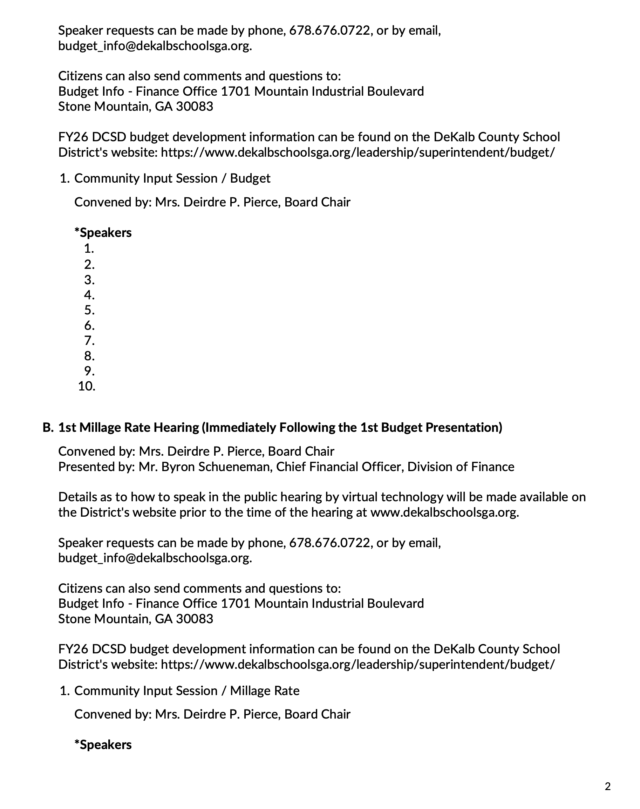 The DeKalb County Board of Education will hold the 1st public budget presentation and 1st millage ratehearing to solicit feedback from the public regarding the 2025-2026 school system’s budget onFriday, May 30, 2025. The public presentation and hearing is in-person and will be held in theJ. David Williamson Board Room, Robert R. Freeman Administrative Complex, 1701 Mountain IndustrialBoulevard, Stone Mountain, Georgia 30083.10:00 am 1st PUBLIC BUDGET PRESENTATION1st MILLAGE RATE HEARINGCOMMUNITY INPUT – BUDGET AND MILLAGE RATEThe meeting agenda is attached and can be accessed online by going to: www.dekalbschoolsga.org,click on Leadership, go to Simbli (formally known as eBoard) Home Page and click on the date for themeeting agenda/information. FY2025 DCSD budget development information can be found on the DeKalbCounty School District’s website at https://www.dekalbschoolsga.org/leadership/superintendent/budget/.The meeting can be viewed at the following link on DeKalb Schools TV (DSTV) by going to: