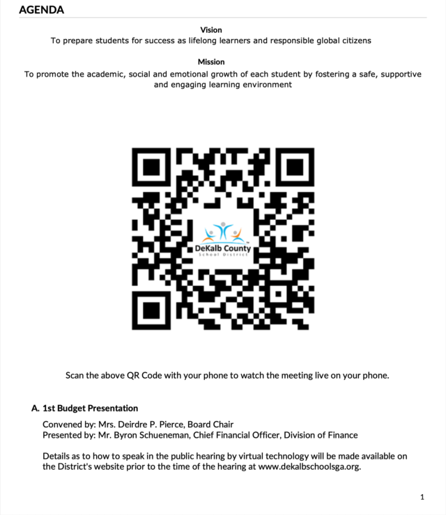 The DeKalb County Board of Education will hold the 1st public budget presentation and 1st millage ratehearing to solicit feedback from the public regarding the 2025-2026 school system’s budget onFriday, May 30, 2025. The public presentation and hearing is in-person and will be held in theJ. David Williamson Board Room, Robert R. Freeman Administrative Complex, 1701 Mountain IndustrialBoulevard, Stone Mountain, Georgia 30083.10:00 am 1st PUBLIC BUDGET PRESENTATION1st MILLAGE RATE HEARINGCOMMUNITY INPUT – BUDGET AND MILLAGE RATEThe meeting agenda is attached and can be accessed online by going to: www.dekalbschoolsga.org,click on Leadership, go to Simbli (formally known as eBoard) Home Page and click on the date for themeeting agenda/information. FY2025 DCSD budget development information can be found on the DeKalbCounty School District’s website at https://www.dekalbschoolsga.org/leadership/superintendent/budget/.The meeting can be viewed at the following link on DeKalb Schools TV (DSTV) by going to: