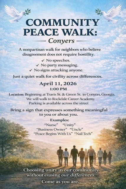 CONYERS, GA—A community Peace Walk will be held on Saturday, April 11, 1 p.m., in Conyers. Organizer Anna McLeod says the walk is “a peaceful, nonpartisan event with no speeches or political messaging focused on individuals showing up as themselves in a calm, respectful space.”
