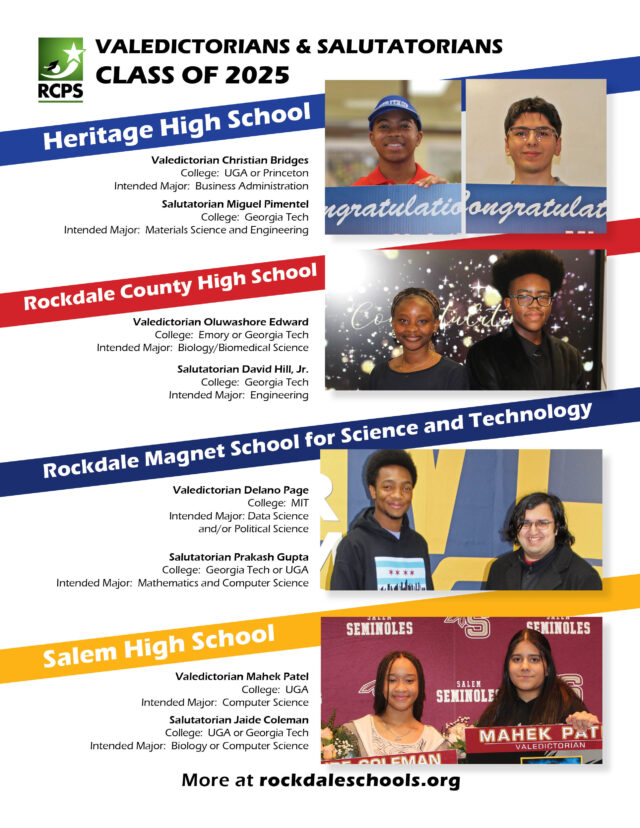 CONYERS, GA – Rockdale County Public Schools (RCPS) congratulates the Valedictorians and Salutatorians of the Class of 2025. The Valedictorians and Salutatorians will lead their senior class in their school’s graduation ceremony, which is scheduled for Wednesday, May 21. For more information, please visit www.rockdaleschools.org/graduation