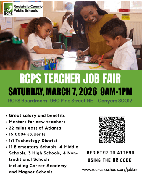 CONYERS, GA – Rockdale County Public Schools (RCPS) invites the best and the brightest to meet the district’s  forward-thinking team at the RCPS Teacher Job Fair on Saturday, March 7, 9 a.m. – 1 p.m,. at the RCPS Board Room, 960 Pine Street NE, Conyers. Participants must pre-register by visiting www.rockdaleschools.org/jobfair.