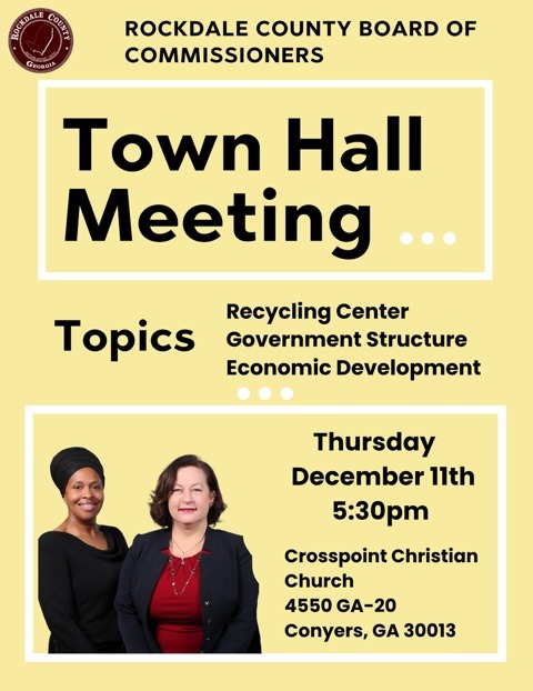 ROCKDALE COUNTY, GA—Rockdale County Board of Commissioners Chair JaNice VanNess and Commissioner Tuwanya Smith will convene the board’s final 2026 town hall on Thursday, Dec. 11. The meeting will be held at 5:30 p.m., Crosspoint Christian Church, 4550 GA Highway-20.