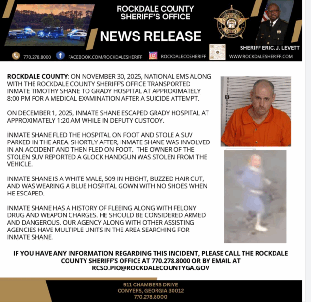“Investigations led to the discovery of the stolen silver in color Pontiac Grand Prix at Publix on Hwy 155 in Henry County. It is confirmed that Inmate Shane requested an uber to a residence in south Rockdale. RCSO units conducted a search warrant of the location and Inmate Shane was not located.