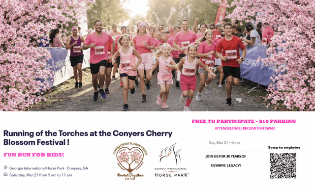 CONYERS, GA—The Conyers Cherry Blossom Festival will burst into bloom Saturday, March 21, with the Running of the Torches, aceremonial fun run that brings the community together in the spirit of history,tradition, and connection.