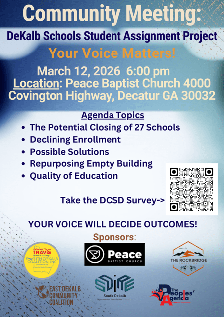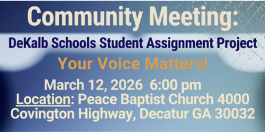The forum is being organized by The Rockbridge Coalition, SDIAE (South DeKalb Improvement Association for Education), the South DeKalb Coalition, East DeKalb Community Coalition, The People’s Agenda, and other civic partners. School district officials are expected to attend.