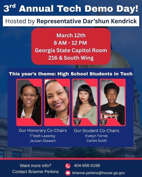 ATLANTA – State Rep. Dar’shun Kendrick (D-Lithonia) will host her third annual Tech Demo Day on Thursday, March 12, 8 a.m. – 12 p.m., at the South Wing of the Georgia State Capitol.
