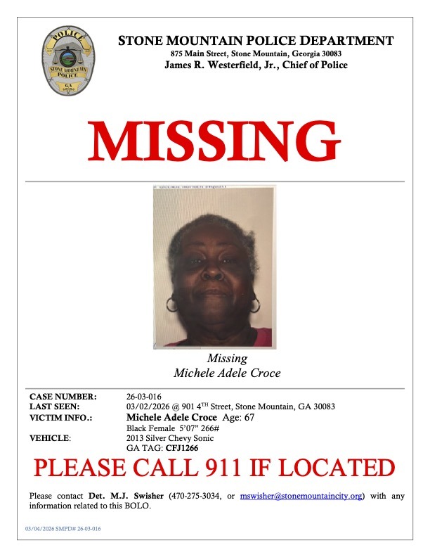 Anyone who has seen Croce or her silver 2013 Chevy(GA Tag: CFJ1266) Sonic is asked to contact Det. M.J. Swisher at 470-275-3034 or mswisher@stonemountaincity.org.