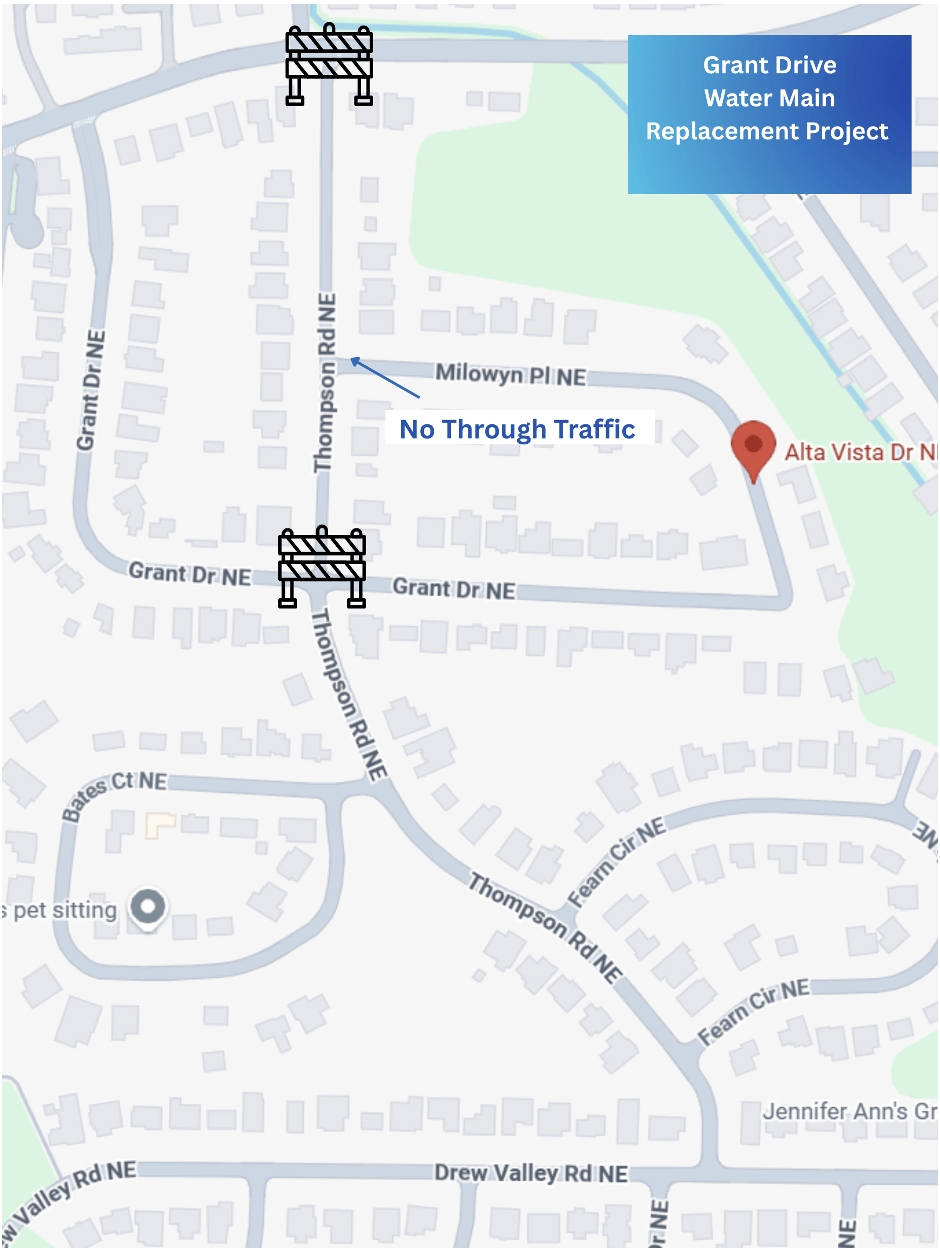 DECATUR, GA – Beginning Wednesday, Feb. 25, Thompson Road between Dresden Drive and Grant Drive will close to through traffic for approximately four weeks, barring any weather delays. The project will require a road closure to replace water lines as a part of the Grant Drive Water Main Replacement Project.