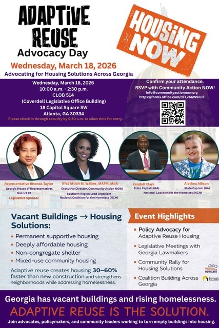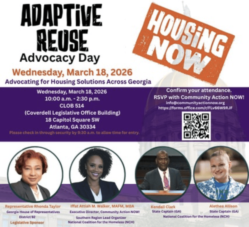 Community Action NOW!, in partnership with the National Coalition for the Homeless and State Rep. Rhonda Taylor (House District 92), will host the “Georgia Adaptive Reuse Education Day.”